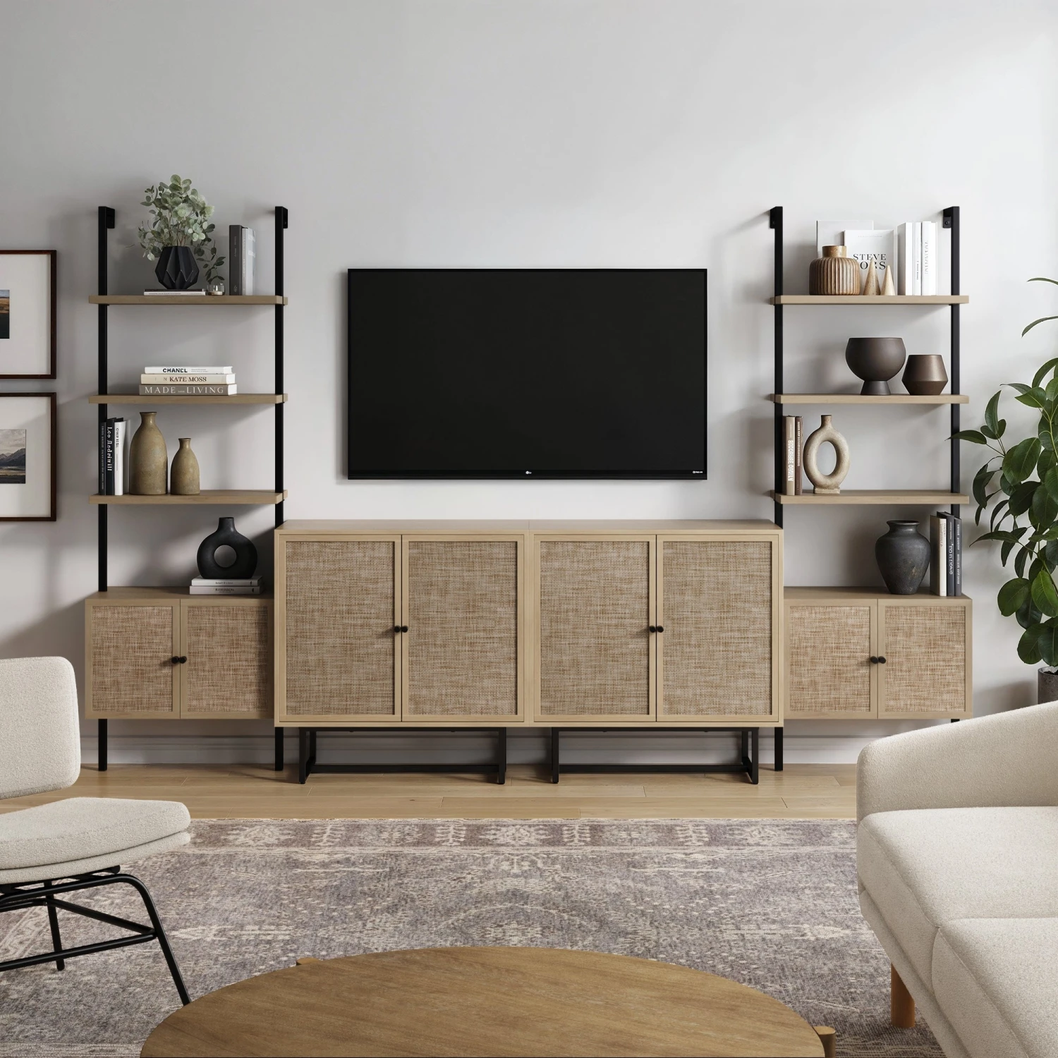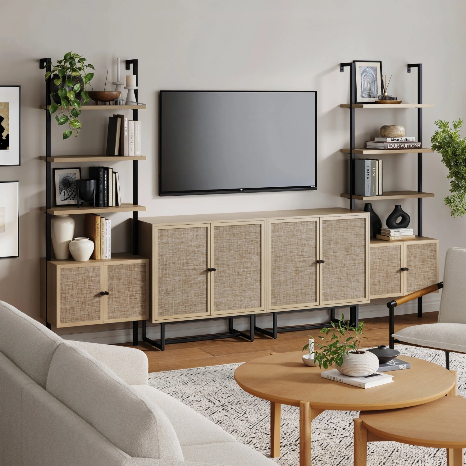 A beautiful boho wall shelving system made easy! We’ve paired our best-selling Kova storage cabinets with our best-selling Theo bookshelves to create a gorgeous rattan wall shelving system. Featuring durable faux rattan door fronts, a light oak finish and space for just about everything, this wall storage bundle is sure to turn heads!