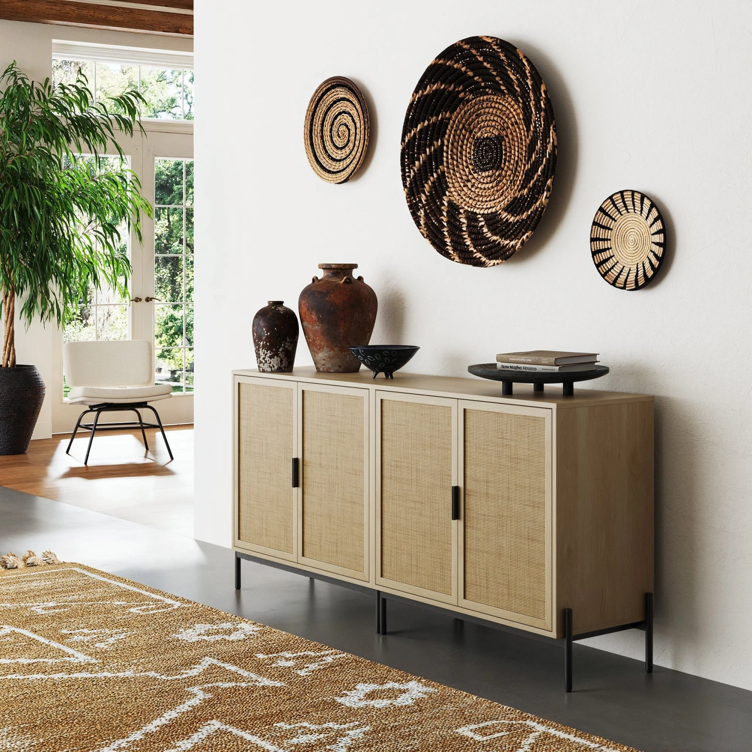 - Boho meets modern Sturdy metal base Interchangeable leg options allow multiple units to sit flush side-by-side Natural rattan doors Due to characteristics of natural rattan, each piece is unique and products will have variations in color and texture
