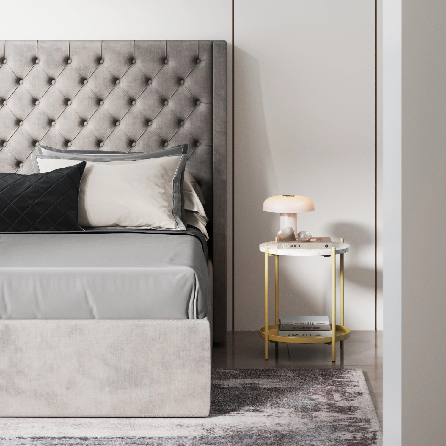 The Alexis end table is small but mighty, boasting a gold metal frame and chic faux white marble top. This two tier end table is an elegant living room addition for placing magazines, snacks, or beverages. The legs are connected with a metal tray for maximum stability, adding function with its mid-century appearance. Alexis is proof that small spaces can still have stunning statement pieces.
