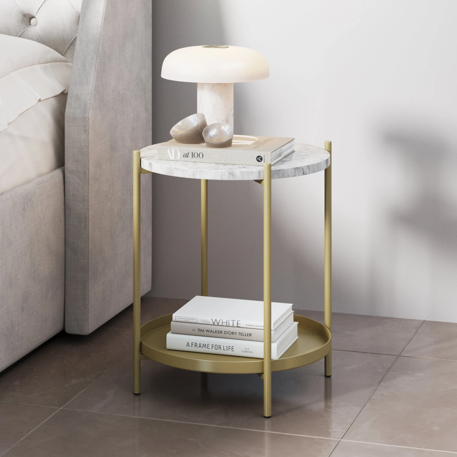 - Alexis’s two-tier side table with a gold/brass finish metal frame is an elegant living room addition for placing magazines, snacks, or beverages