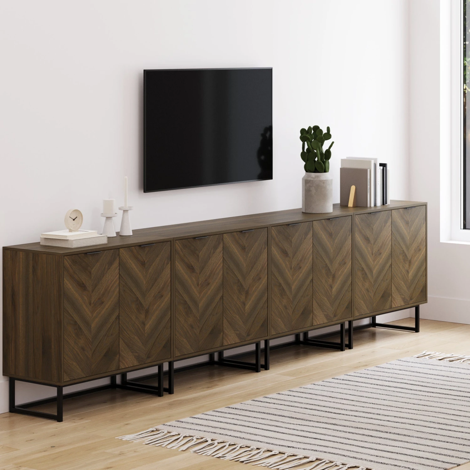 A hideaway so beautiful, we had to make it in another color! The set of 4 Enloe storage cabinets feature rustic walnut paper doors that have beautiful herringbone design for a modern meets rustic feel. The cabinets are held up on beautiful matte black metal legs that have footpads attached to keep your floors from being scratched. With two swinging doors, these cabinets offer plenty of hidden storage and enough space to keep your home clutter-free.