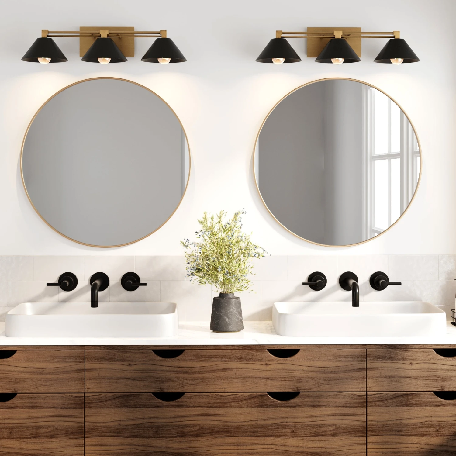 Brighten up your space with our industrial glam Ronnie vanity light. Its three bulb capacity ensures you’ll have plenty of light to brighten up any space—above a mirror in your bathroom, over a gallery wall in your living room, even above a window in your kitchen. The two-toned vintaged brass and matte black finish brings a hint of luxury and glam to any space—the brass finish isn’t too yellow and gives a softer look that fits any modern interior. Plus, our vanity lights are all damp rated, meaning they were designed for use in damp spaces, such as bathrooms and kitchens.
