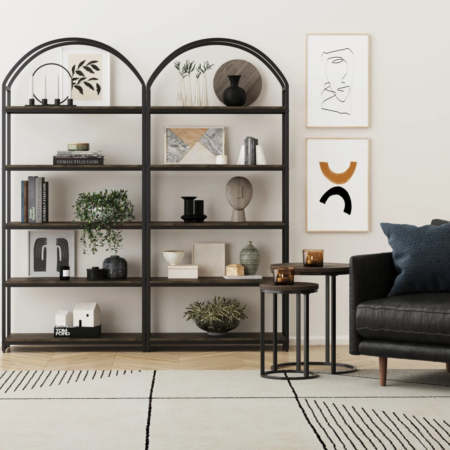 Our beautiful Haven etagere bookcase features five nutmeg-finish shelves elevated on a matte black metal frame. The sleek and durable frame is topped with an arched design that’s sure to make a statement. Its minimal silhouette fits perfectly in any home, bringing style and storage to your space. Complete the look with your favorite books and house plants for that picture-perfect shelfie moment.