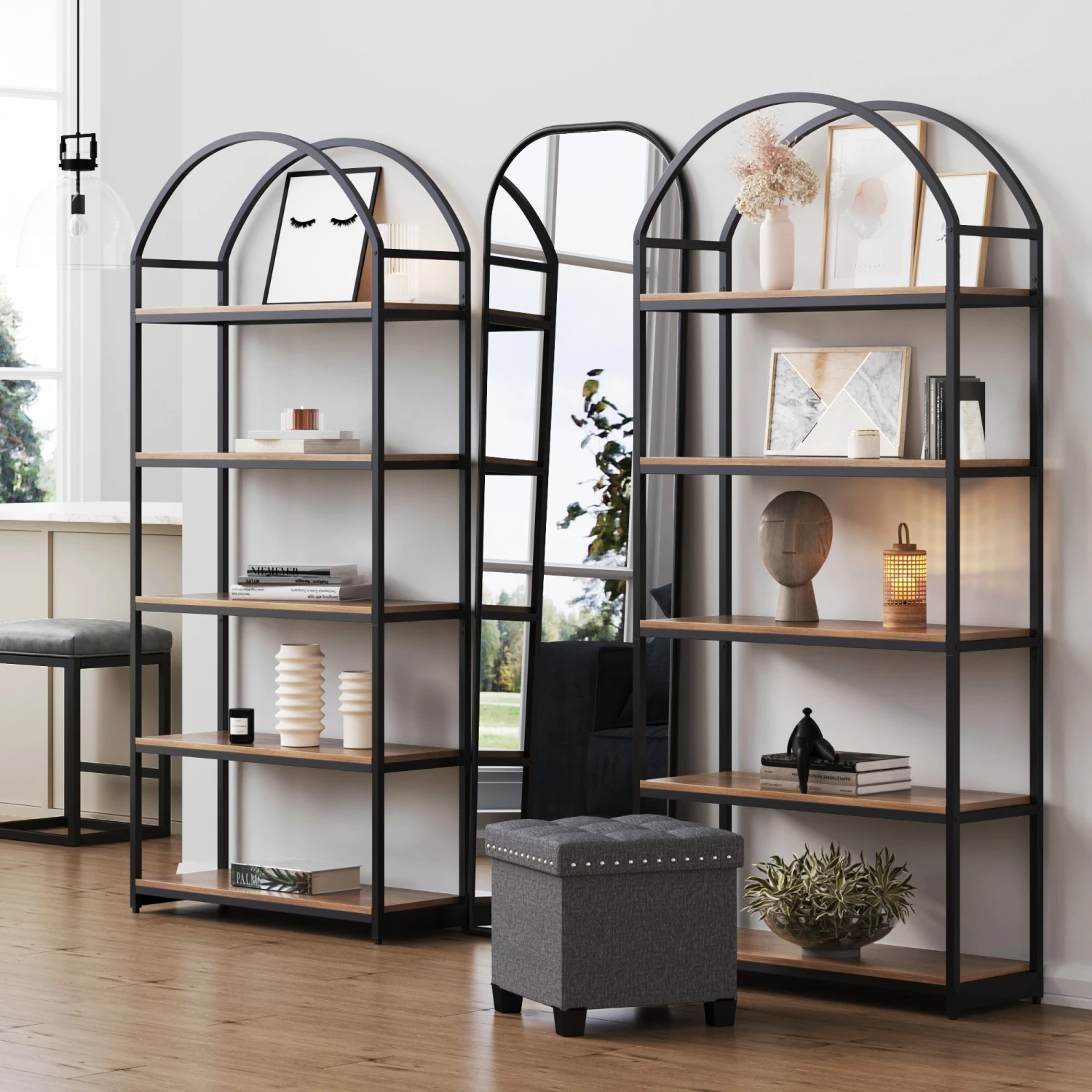 Our beautiful Haven etagere bookcase features five reclaimed oak-finish shelves elevated on a matte black metal frame. The sleek and durable frame is topped with an arched design that’s sure to make a statement. Its minimal silhouette fits perfectly in any home, bringing style and storage to your space. Complete the look with your favorite books and house plants for that picture-perfect shelfie moment.