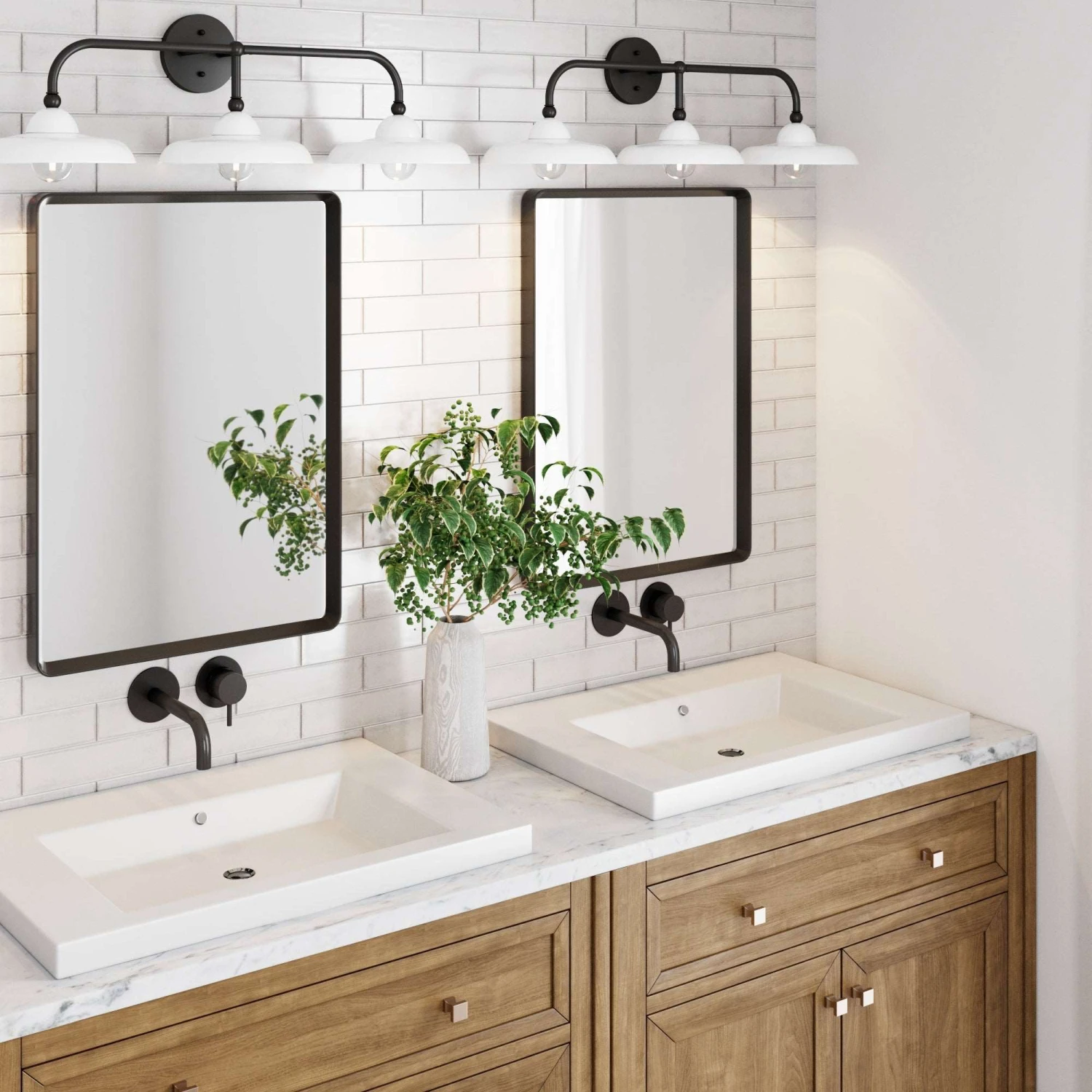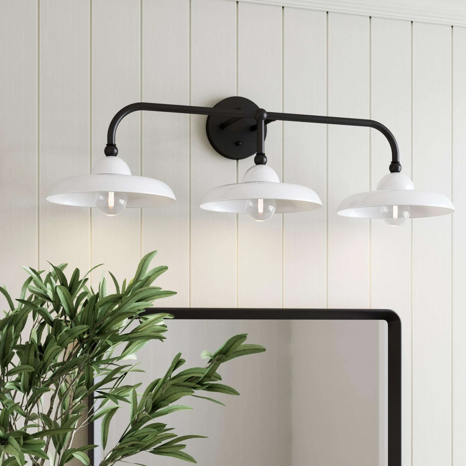 Make your modern farmhouse dreams come true with the Mable bathroom vanity. It features three rounded white metal shades that point downwards to add the perfect amount of light to bathrooms, kitchens, or hallways. Its contrasting design is completed with a matte black metal frame, making this piece the perfect final touch to your modern farmhouse living space.
