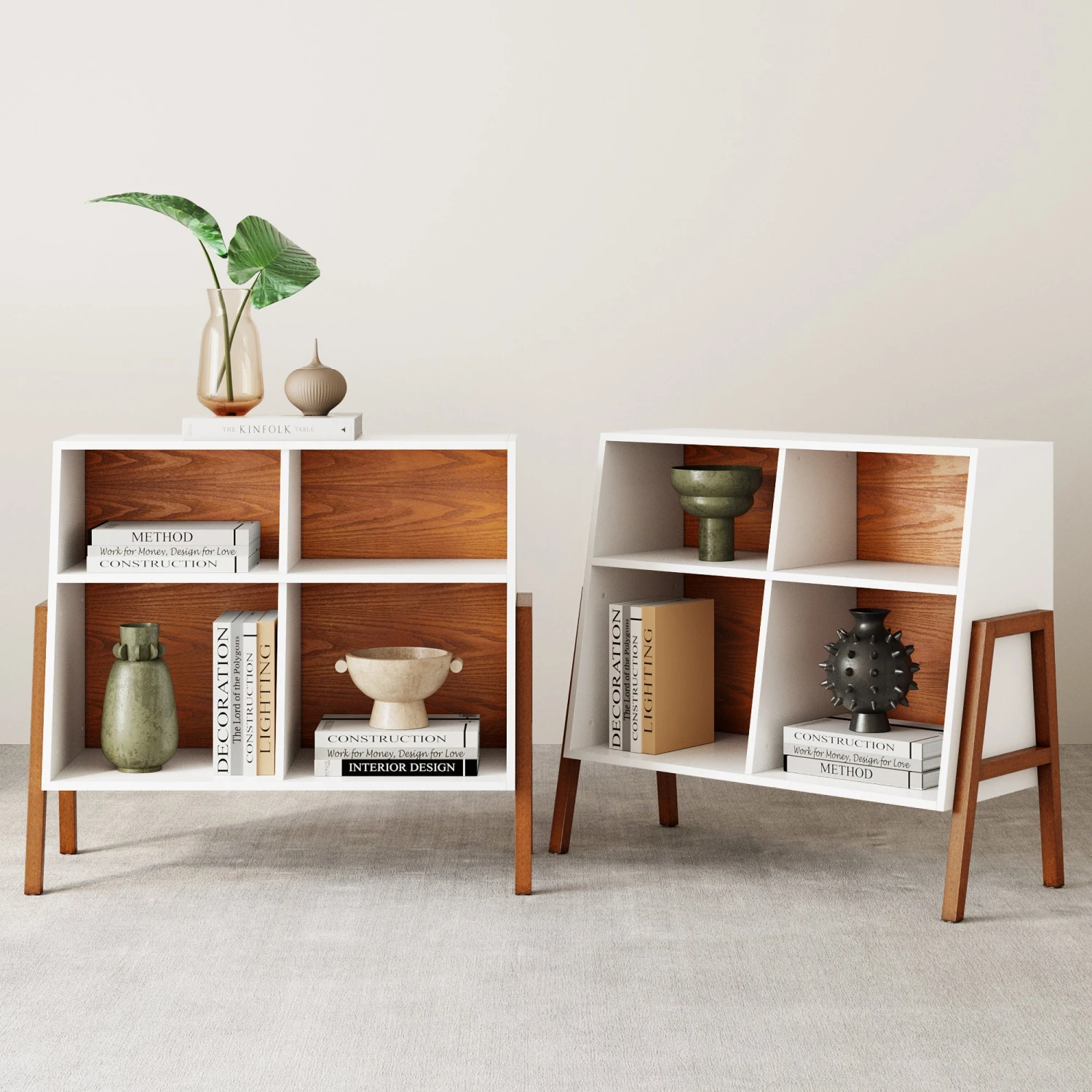 The Telos console table set in a medium brown finish pairs smooth with glossy white frame. Four open cubbies makes room your baskets, picture frames and stereo systems. Interesting angled design gives an edge to a standard box cubby unit, guaranteed to make a statement in any room. Legs arrive pre-assembled making assembly as easy as 1-2-3. Sturdy and built to last for years to come.