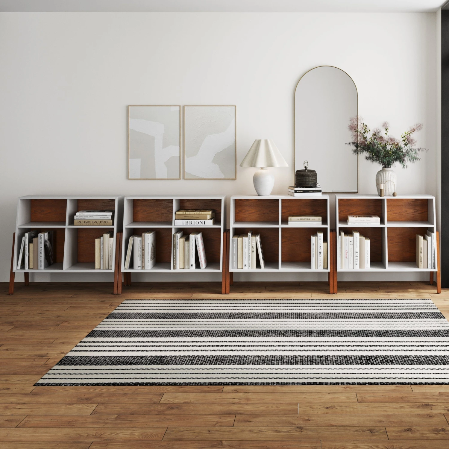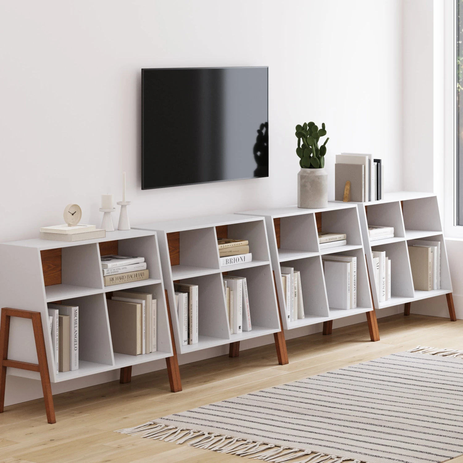 The Telos large console medium brown finish pairs smooth with glossy white frame. Four open cubbies makes room your baskets, picture frames and stereo systems. Interesting angled design gives an edge to a standard box cubby unit, guaranteed to make a statement in any room. Legs arrive pre-assembled making assembly as easy as 1-2-3. Sturdy and built to last for years to come.