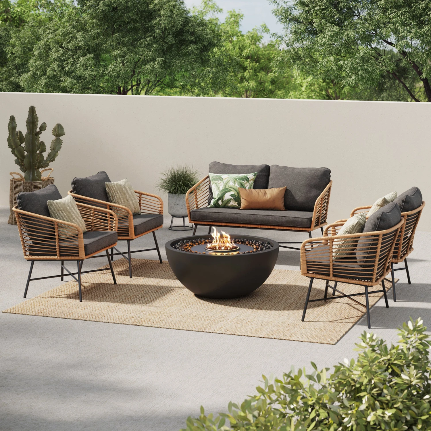 Introducing the perfect addition to your bohemian outdoor living space—the Flow Outdoor Seating set! Designed with your comfort and convenience in mind, this set of 4 outdoor chairs and 1 loveseat features removable and washable cushion covers and rust-proof aluminum frames and hardware. The ergonomic back was designed to provide optimal comfort during extended periods of use—outdoor siesta, anyone? Flow boasts high UV fade-resistant and weather-resistant fabric, ensuring that it can withstand the elements (and spilled drinks) for years to come. The synthetic resin wicker-wrapped frame details add a touch of sophistication and style, while the plush 3.5″ thick foam cushions provide the ultimate comfort.