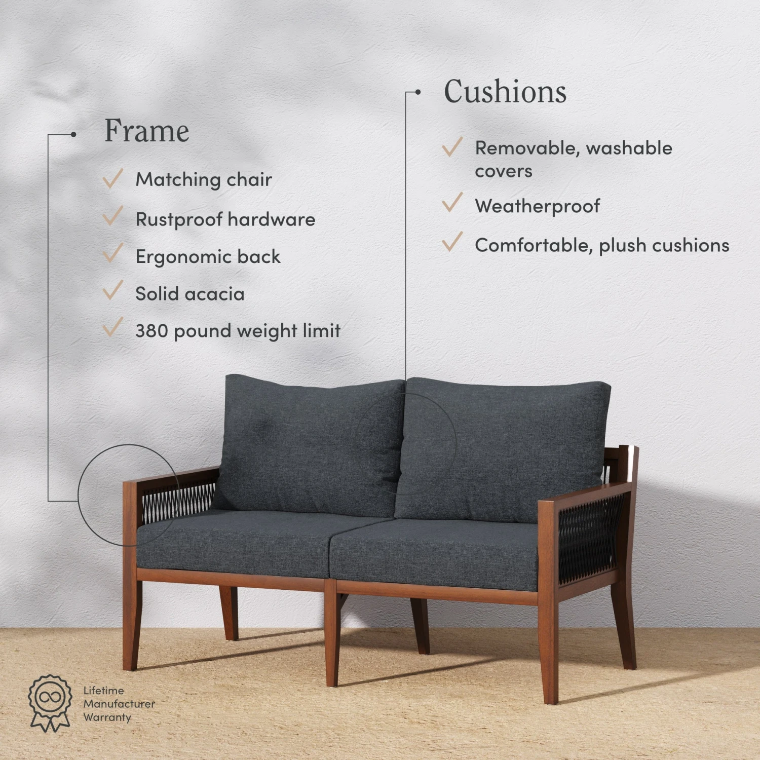 - Weatherproof solid acacia wood frame