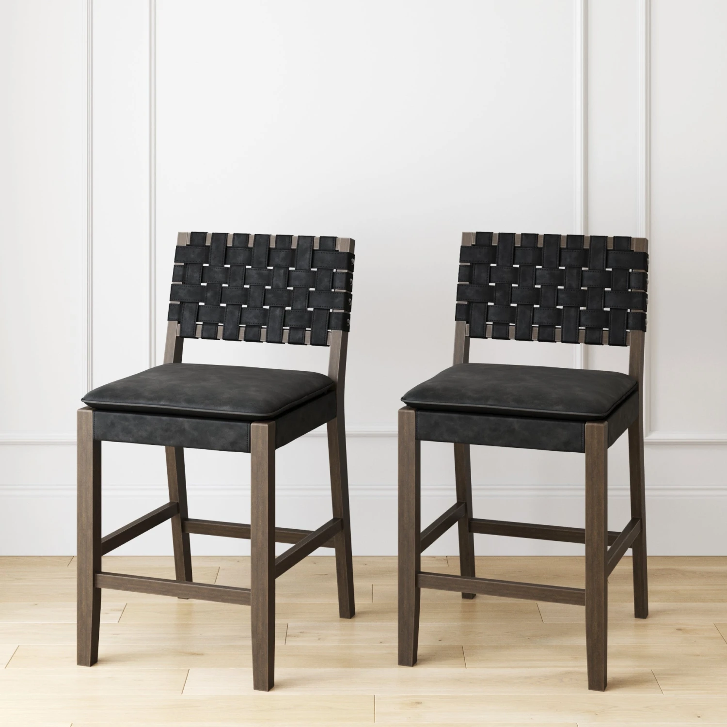 Grab your favorite drink and sit comfortably for hours on our mid-century modern Cohen bar stools. Cohen’s solid wood frame has a hard wearing graphite black painted finish and is complemented by a woven brushed black PU leather back that adds sophistication to your kitchen, even when tucked and hidden under the counter. We even added a comfortable padded saddle seat with rounded corners and perfectly placed foot rests. If you take a closer look you’ll see studs on the side of the chair—a detail too luxurious to miss! With an easy 25 minute assembly time, you won’t regret grabbing this set of 2!