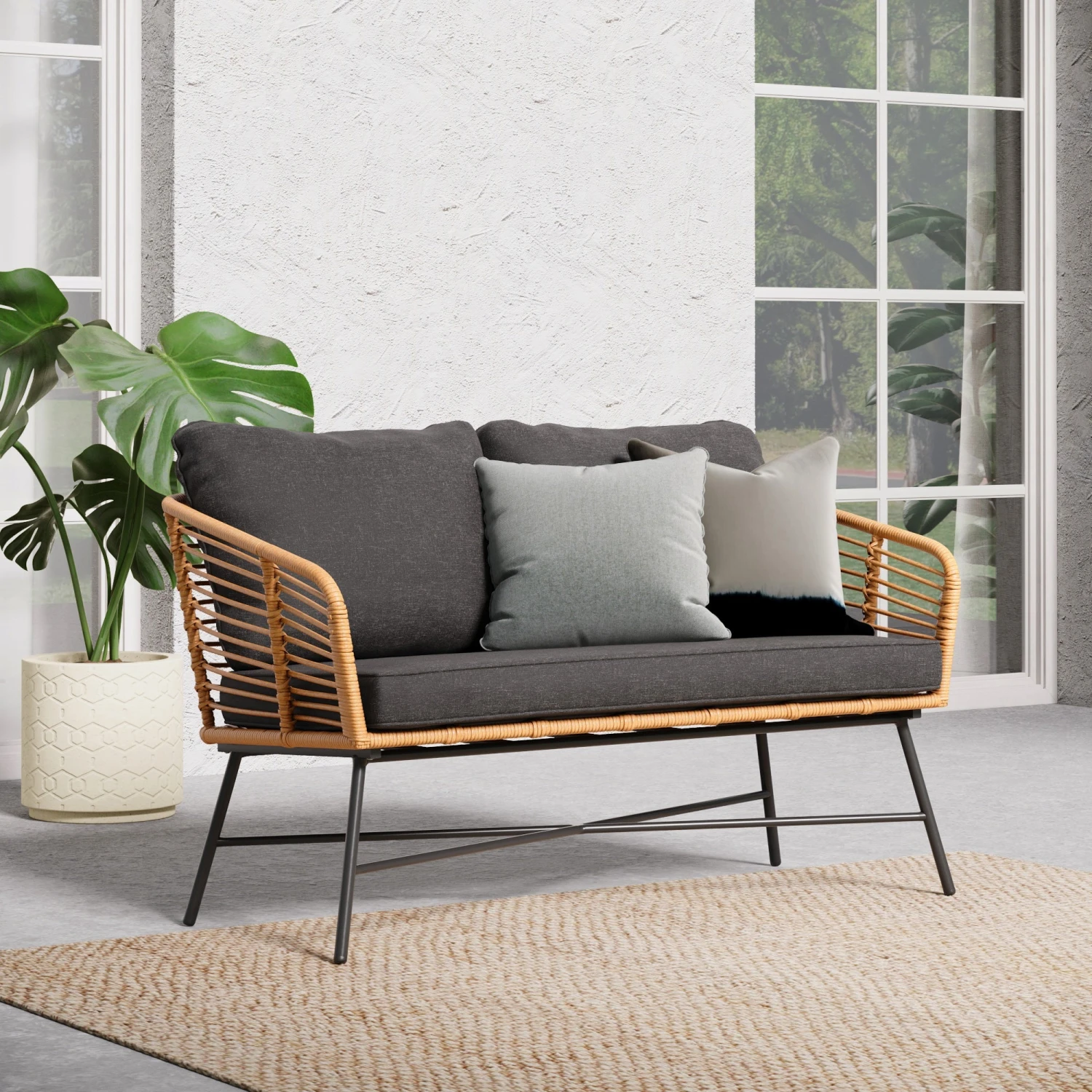 Introducing the perfect addition to your bohemian outdoor living space—the Flow Outdoor Seating set! Designed with your comfort and convenience in mind, this set of 2 outdoor loveseats features removable and washable cushion covers and rust-proof aluminum frames and hardware. The ergonomic back was designed to provide optimal comfort during extended periods of use—outdoor siesta, anyone? Flow boasts high UV fade-resistant and weather-resistant fabric, ensuring that it can withstand the elements (and spilled drinks) for years to come. The synthetic resin wicker-wrapped frame details add a touch of sophistication and style, while the plush 3.5″ thick foam cushions provide the ultimate comfort.
