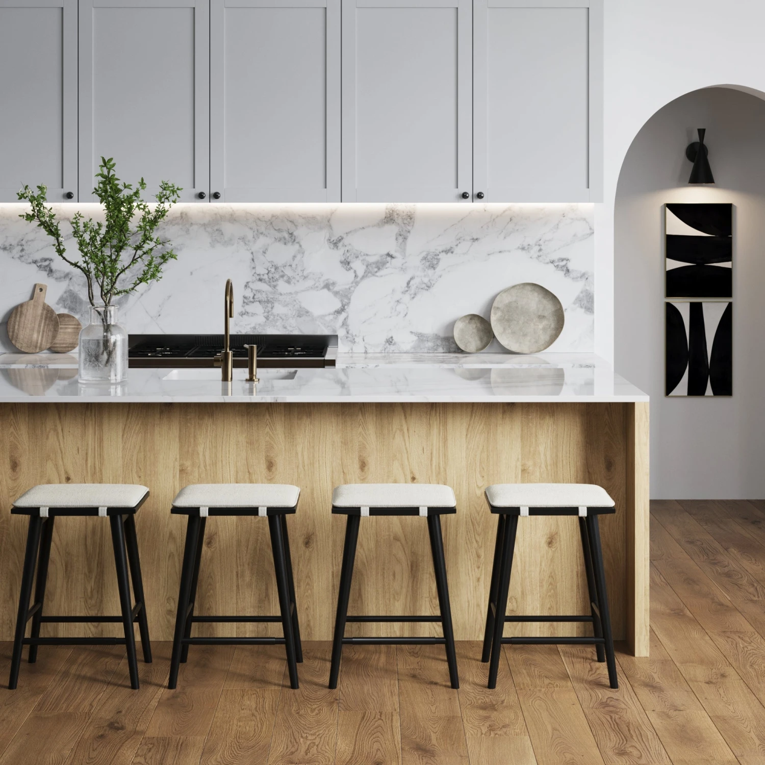 Keep your kitchen guest-ready with our mixed-material Barker bar stools. Sit comfortably for hours on its removable padded saddle seat that’s made of natural textured linen weave fabric and held up by black solid wood legs and perfectly-placed foot rests. Plus, it features a metal frame over the footrest to avoid any scratches. Assemble these in no time at all with our easy-to-follow instructions and included hardware. At 25″ tall, these refined mid-century modern stools are perfect for tucking under your kitchen counter when not in use. We have no doubt that this bar stool is going to be a dinner party favorite.