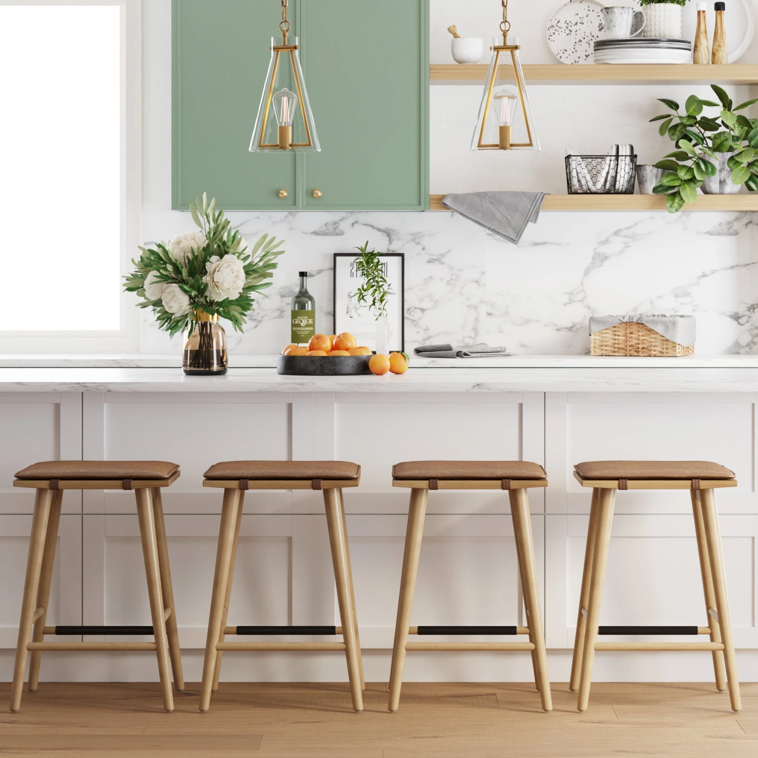 Keep your kitchen guest-ready with our mixed-material Barker bar stools. Sit comfortable for hours on its removable padded saddle seat that’s made of easy-to-wipe-clean faux leather and held up by solid wood legs and perfectly-placed foot rests. Plus, it features a metal frame over the footrest to avoid any scratches. Assemble these in no time at all with our easy-to-follow instructions and included hardware. At 25″ tall, these refined stools are perfect for tucking under your kitchen counter when not in use. We have no doubt that this bar stool is going to be a dinner party favorite.