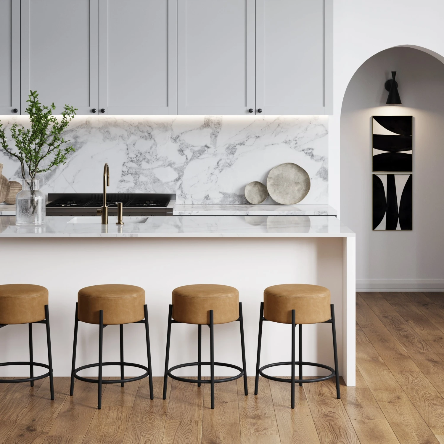 Meet Isaac, the bar stool you’ll never want to get up from. With a soft padded seat covered in our gorgeous Italian Turin light brown faux leather, Isaac is the perfect combination of form and function. The contrasting black metal frame with built in footrest keeps your legs comfortable as you sip on that end-of-day rosé. Its 24” height means it will fit perfectly at counter height. And with a 15 minute assembly time, your kitchen will gorgeous in no time, with almost no effort! We love that for you.