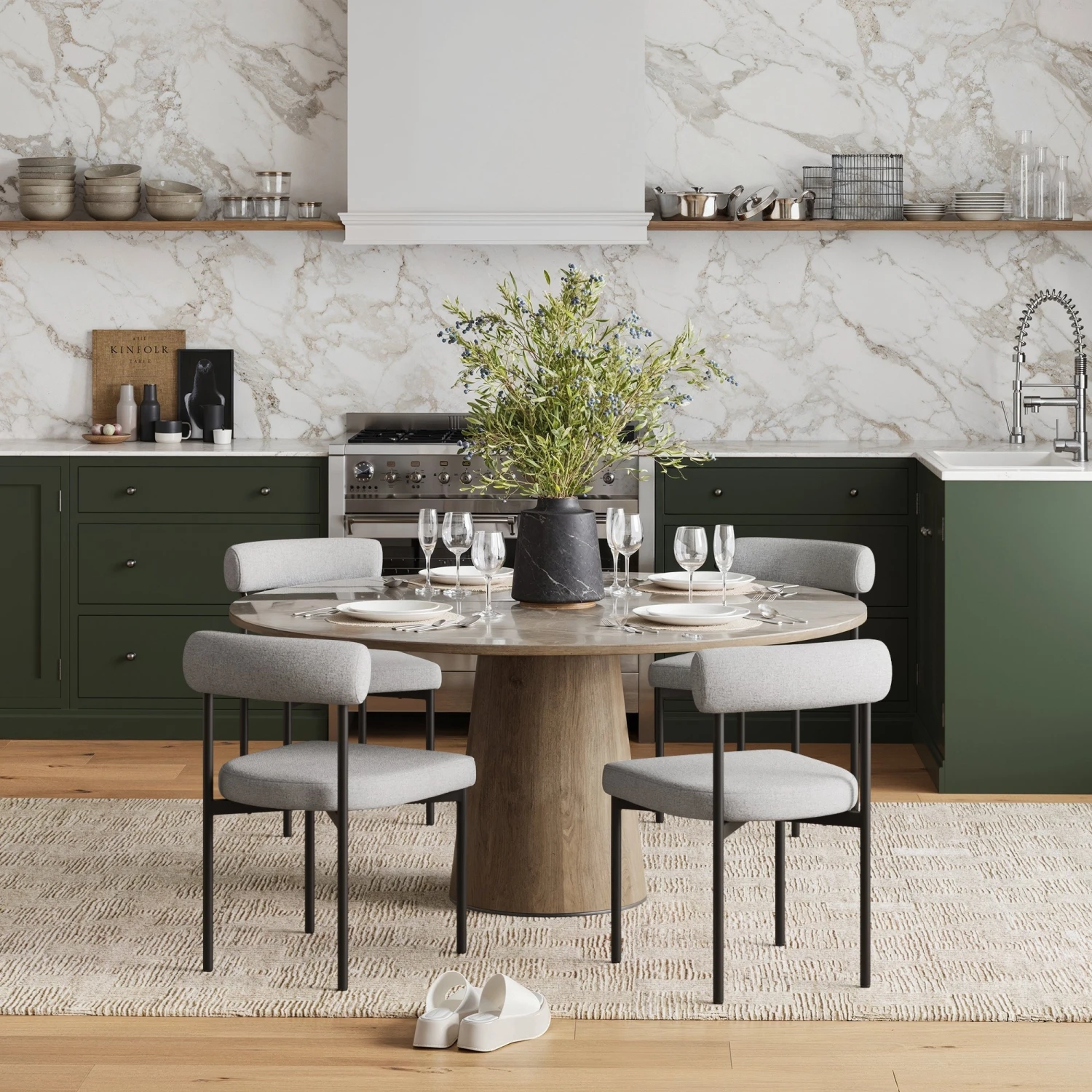 Introducing the Dahlia dining chair, a modern twist on the mid-century stool. Inspired by iconic designs, this chair combines style and comfort seamlessly. The cushioned seat and back, covered in light feather gray upholstery, provide a luxurious feel while ensuring optimal comfort. With its sleek wire frame, the Dahlia dining chair adds a touch of sophistication to any dining space. Elevate your dining experience with this chic and cozy seating option that effortlessly blends contemporary aesthetics with timeless elegance. Pair with the Dahlia bar stool to make it a set!