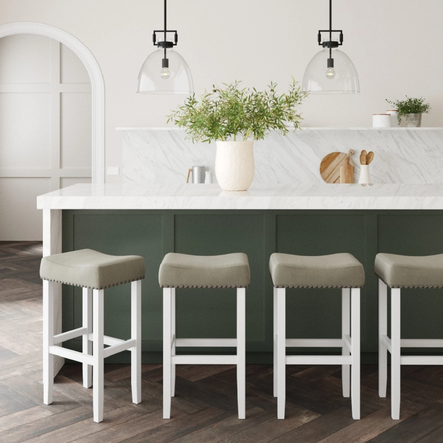 Add some charming farmhouse vibes to your home with Hylie stool. The Hylie stool is beautifully crafted from solid wood with rectangular saddle seating finished with soft upholstered fabric seat and vintage nailhead details. Durable curved thick cushions to sit comfortable for hours. Stylish yet practical built in foot rest, these create perfect accents to spruce up your kitchen or home bar.