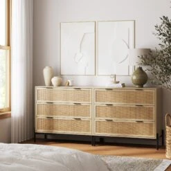 Rattan, Wood & Metal 3-Drawer Dresser Oak