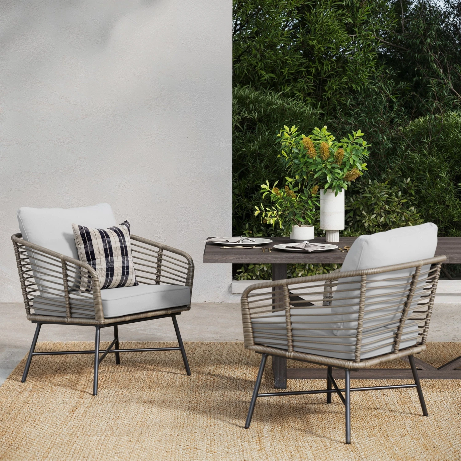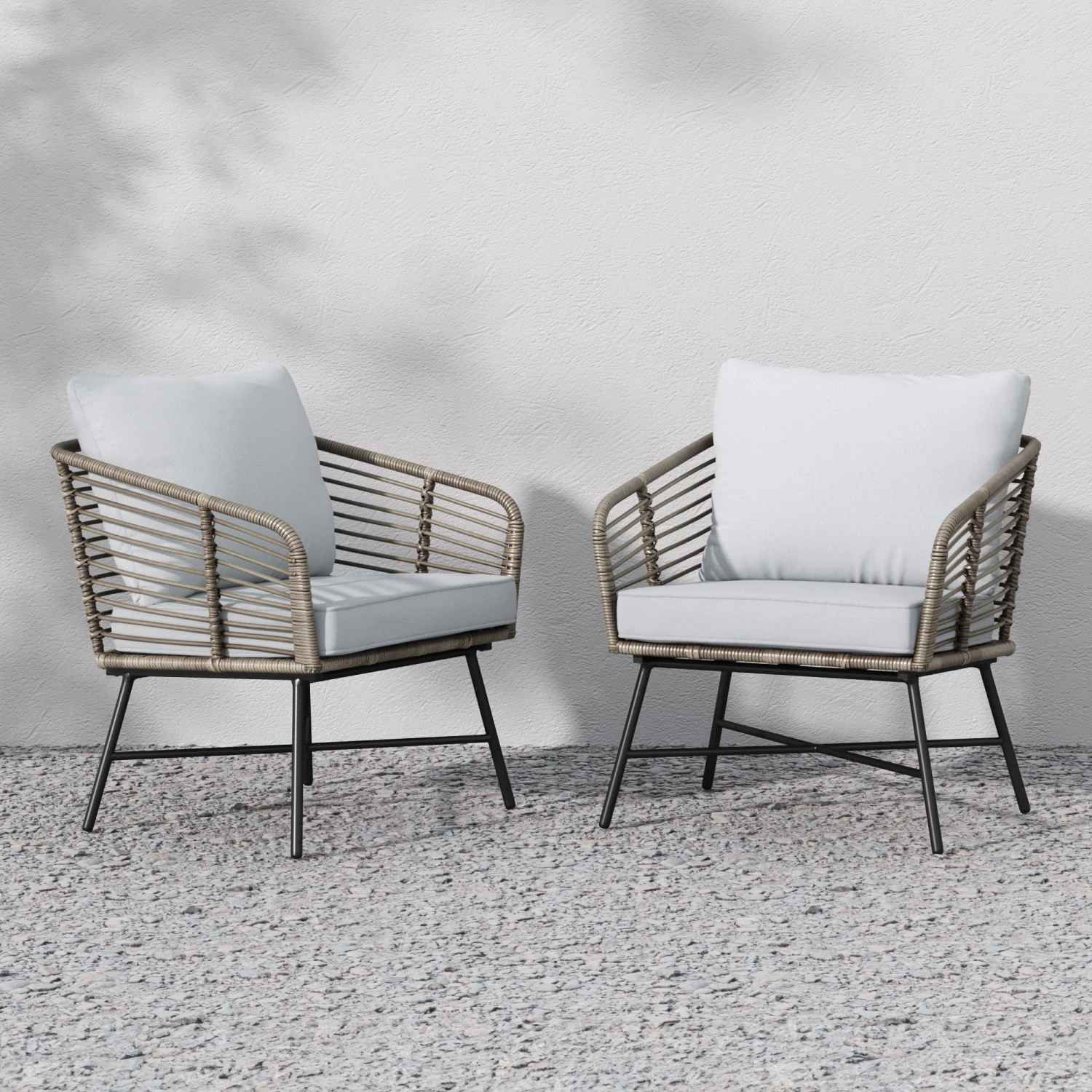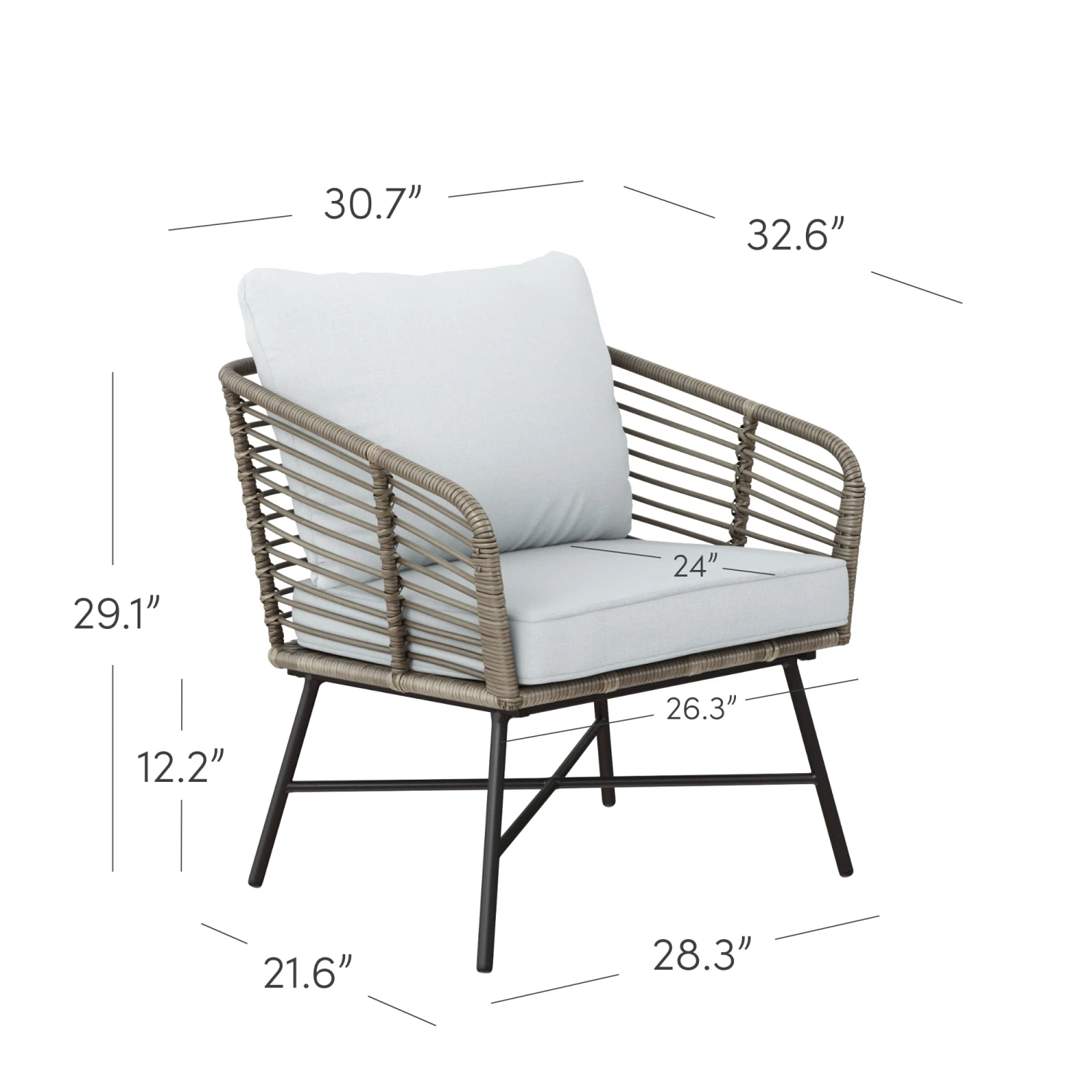 Introducing the perfect addition to your bohemian outdoor living space—the Flow Chair set! Designed with your comfort and convenience in mind, this patio chair set of 2 features removable and washable cushion covers and rust-proof aluminum frame and hardware. The ergonomic back of this wicker porch chair was designed to provide optimal comfort during extended periods of use—outdoor siesta, anyone? Flow boasts high UV fade-resistant and weather-resistant fabric, ensuring that it can withstand the elements (and spilled drinks) for years to come. The synthetic resin wicker-wrapped frame details add a touch of sophistication and style, while the plush 3.5″ thick foam cushions provide the ultimate comfort. Bonus! You can pair these armchairs with the Flow Loveseat to create a cohesive seating set, or use them as patio dining chairs—perfect for entertaining guests.