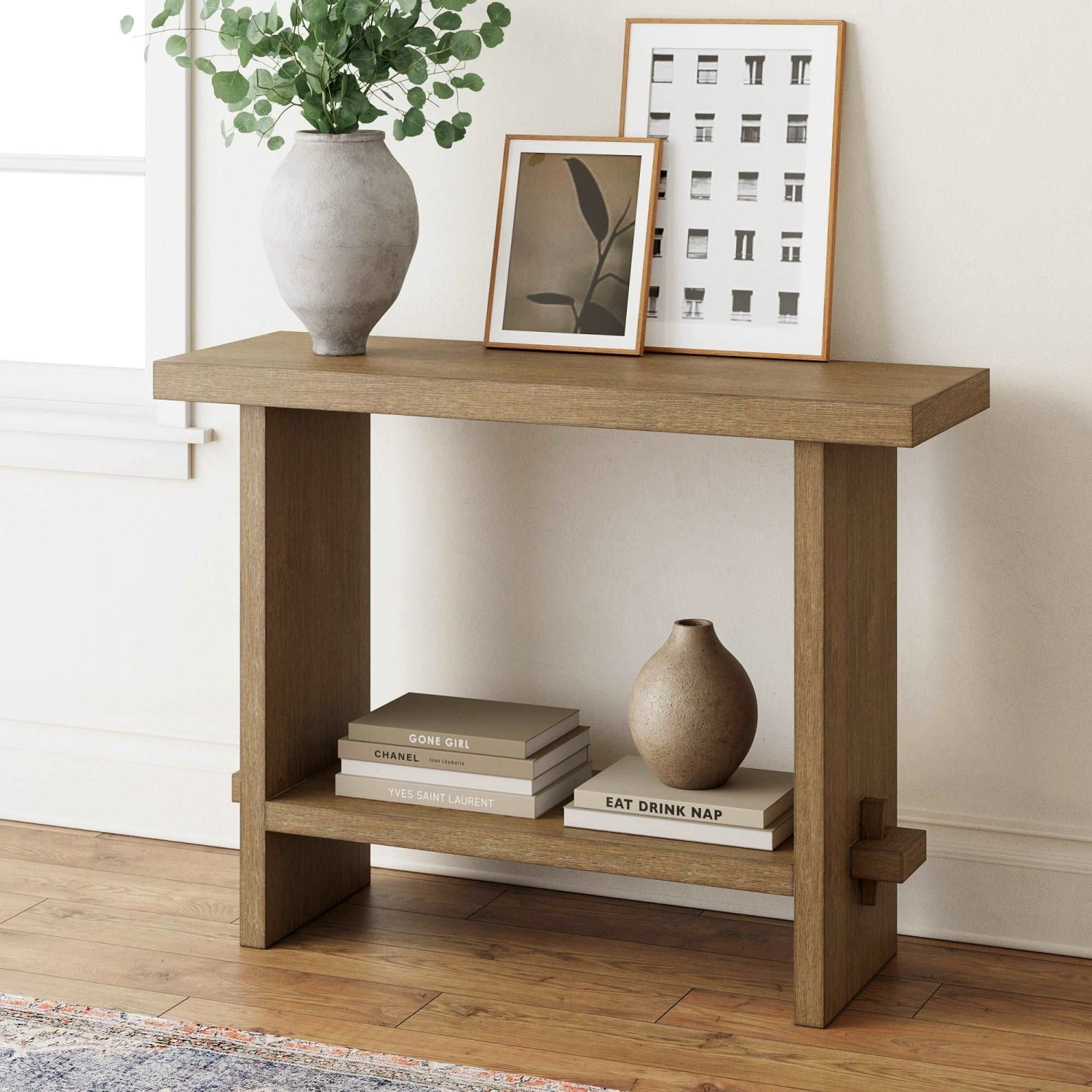 Boasting both modern and farmhouse styles, our Virgo Console table has a neutral wire-brushed light brown finish and faux wedge-through mortise and tenon that instantly elevates the room. This console table adds an inviting touch to your entryway, living room, or hallway and is the perfect landing spot for your phone, keys, or that expensive candle no one’s allowed to light. The top shelf is great for books, a table lamp, or an accent mirror, while the bottom shelf can hold baskets, toys, or even shoes. Designed with elegance in mind, this console table has no exposed hardware, making this a modern farmhouse dream.