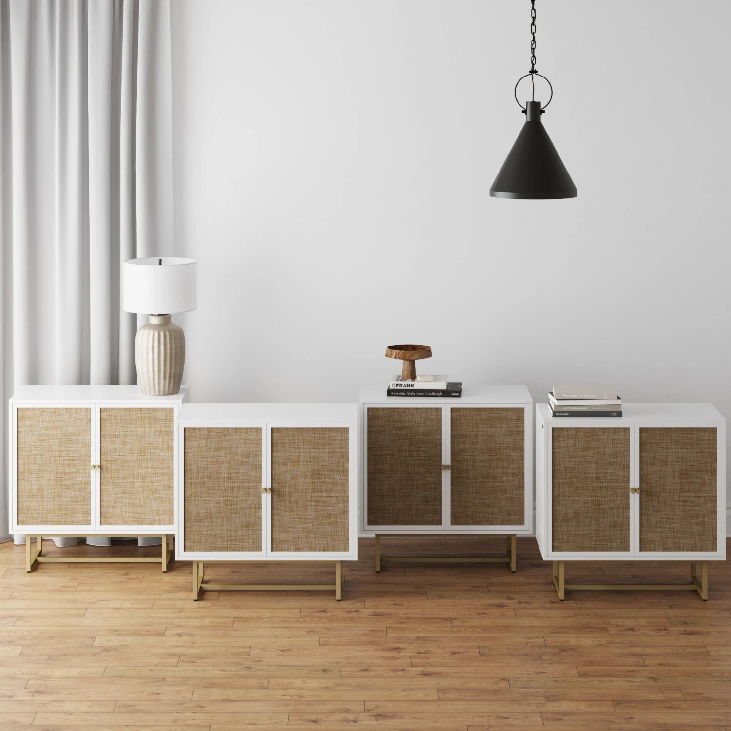 We’ve got all the heart eyes for Kova! Kova features two natural rattan cabinets contrasted with a wood frame in a white finish for an organic texture that balances the sleek profile. This cabinet effortlessly blends beauty with functionality. Use it in your entryway to greet guests, in the living room to display your record player, or as an elegant addition to a dining room. The front cabinets feature stunning gold color handles that opens to reveal two internal shelves that are adjustable and will help keep any room looking organized!