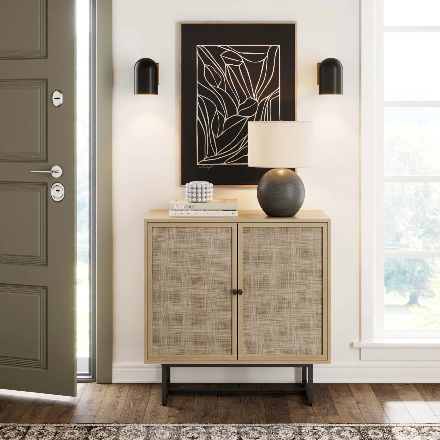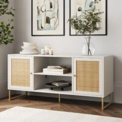 We’ve got all the heart eyes for Kova! Kova features two synthetic rattan cabinets contrasted with a wood frame in a white finish for an organic texture that balances the sleek profile. This cabinet effortlessly blends beauty with functionality. Use it in your entryway to greet guests, in the living room to display your record player, or as an elegant addition to a dining room. The front cabinets feature stunning gold color handles that opens to reveal two internal shelves that are adjustable and will help keep any room looking organized!