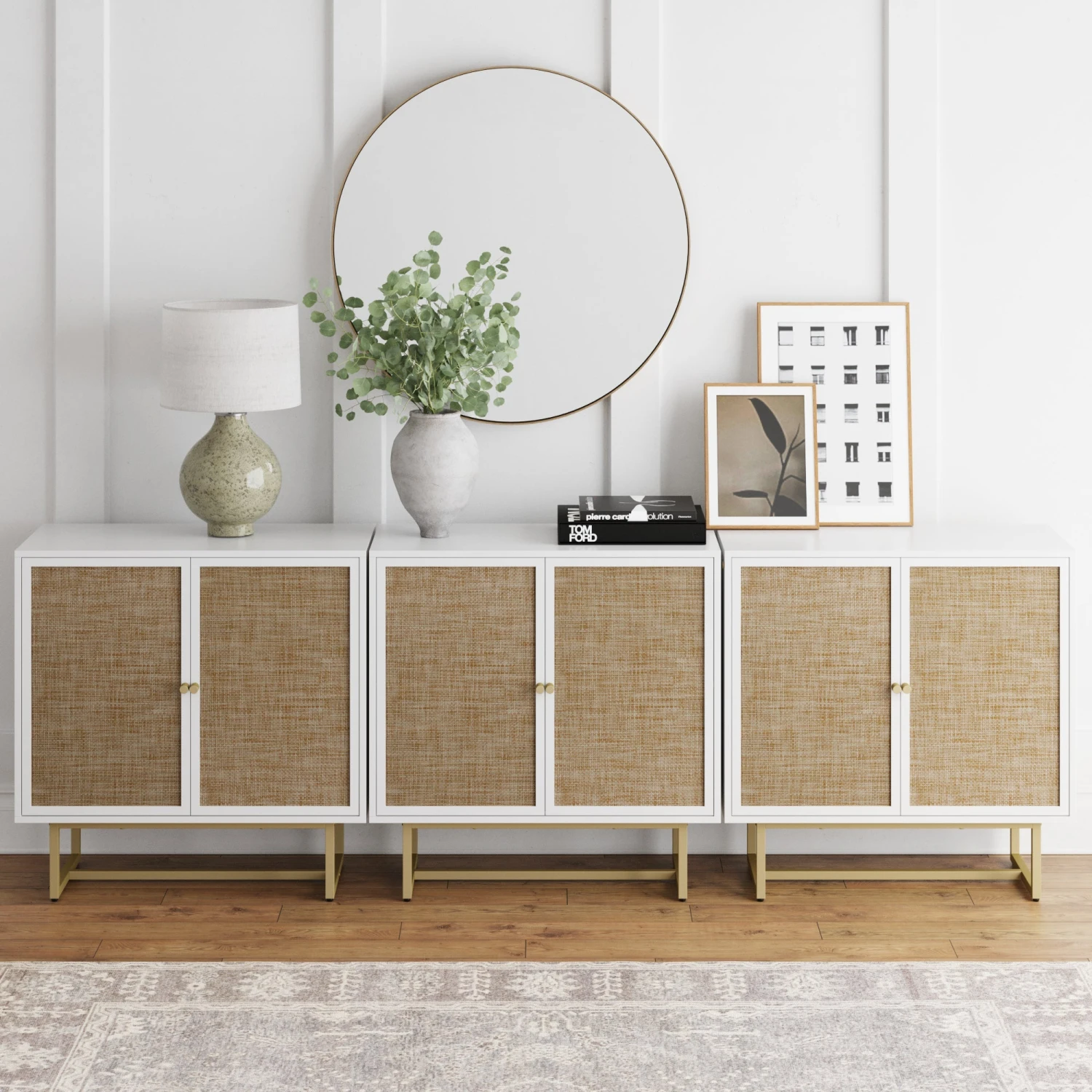 We’ve got all the heart eyes for Kova! Kova features two natural rattan cabinets contrasted with a wood frame in a white finish for an organic texture that balances the sleek profile. This cabinet effortlessly blends beauty with functionality. Use it in your entryway to greet guests, in the living room to display your record player, or as an elegant addition to a dining room. The front cabinets feature stunning gold color handles that opens to reveal two internal shelves that are adjustable and will help keep any room looking organized!