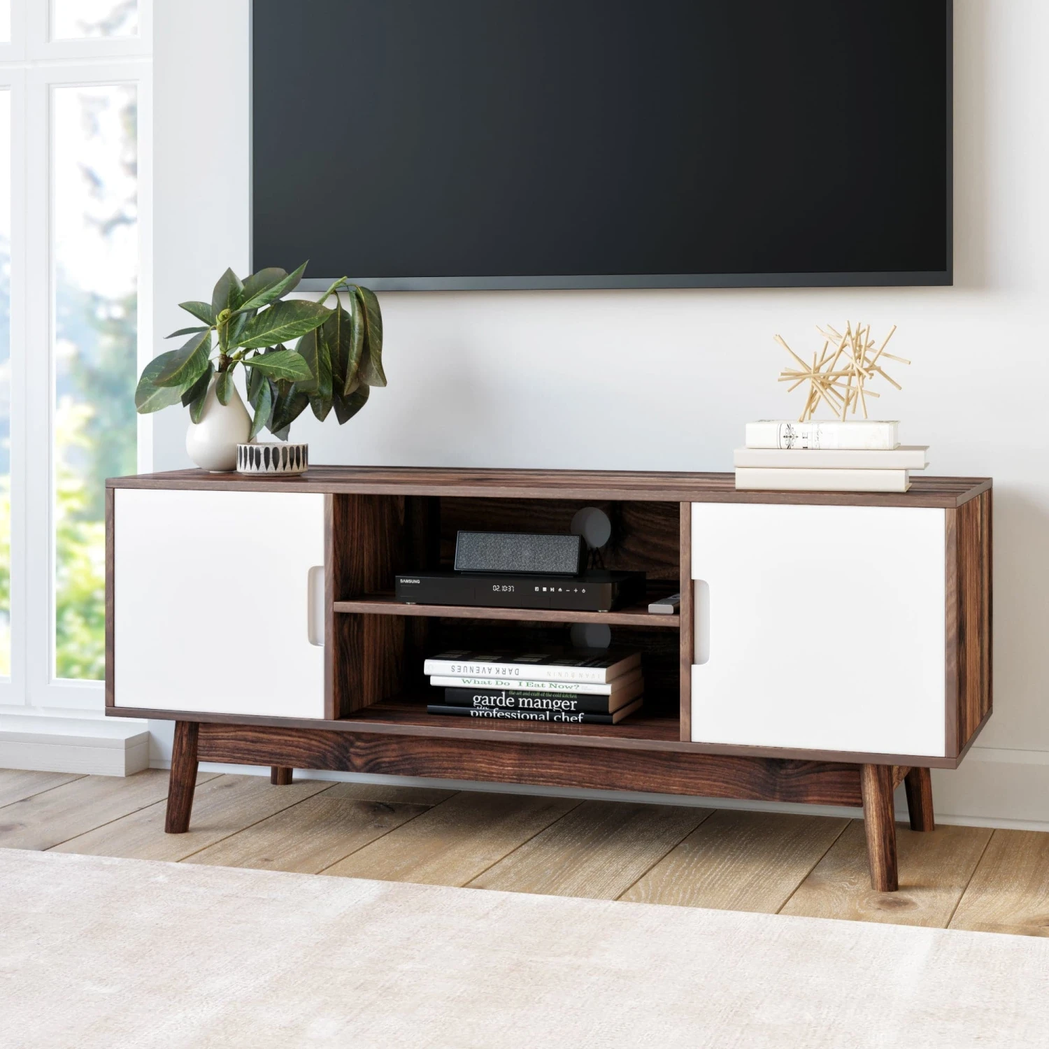 Wesley: pairs well with Netflix and wine. Wesley is a media console that can add a touch of mid-century or Scandinavian style to your home. The groove handle hardware showcases the two cabinet doors for hidden storage, while Wesley’s four splayed legs bring style and functionality to any space. The two middle shelves create the perfect spot for displaying your favorite decor. Business in the front, party in the back – Wesley has hidden cord holes so that the television, gaming console, and smart speakers can all be plugged in while ensuring a clutter-free entertainment center. “Alexa, turn on my weekend playlist.”