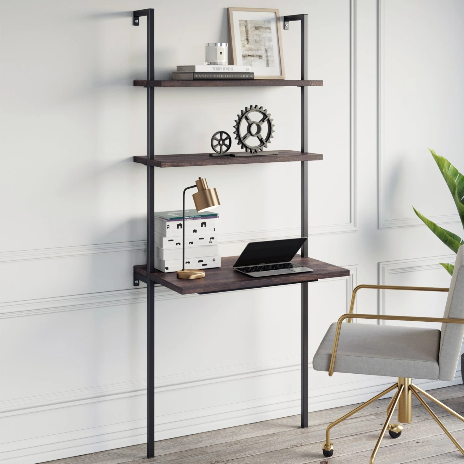 Functional, modular, and minimalist—our best selling Theo bookshelf now comes in a space-saving, wall-mounted desk design. The white and gold finish provides a touch of glam while two open-shelves offer space for books, storage bins, or just for styling with your favorite decor. Quality engineered wood shelves and a sturdy metal frame ensure structural integrity over time (and we even provide an extra mounting plate under the desk to reinforce the wall for additional support). Pair these Theo desks together or with a matching bookcase to create a larger workspace and additional storage. For smaller spaces, install Theo next to a bed so it can double as a nightstand and work area. Easy assembly will have you back to hustling, scheming, and creating in no time. #deskgoals? We think so.